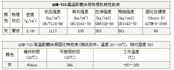 3. 涂敷:QUN-723合适的涂层厚度是2-4mm,应将混合好的材料逐层涂敷于待修部位,一层要压实,使之与基材充分浸润;涂层涂到尺寸后表层要修平整,或用低粘度耐磨胶涂敷涂层表面。本材料不能进行机械加工,应注意控制涂层厚度,以免装配中出现干涉现象。