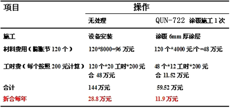 使用QUN-722耐磨陶瓷涂料的经济效益十分显著,仅以某电厂一台机组煤粉管中的膨胀节防磨损为例,简单测算结果如下: